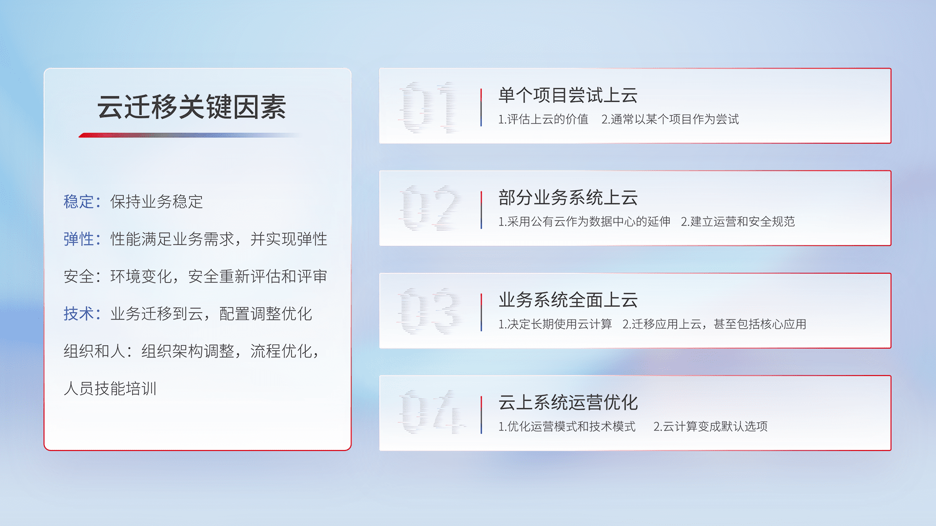 结合实际业务,,从规划设计、、云平台选型、、、云原生改造、、、数据迁移、、集成交付,,迁移全过程为客户识别最佳上云路径,,做好风险识别管理,,设计网络架构、、身份权限、、、、安全审计合规、、、操作审计、、日志审计、、、、监控告警策略、、、多站点容灾设计等,,,对云上基础设施进行整体规划,,提升IT治理水平,,,,以满足弹性、、、、高可用、、高性能的需求。。。。