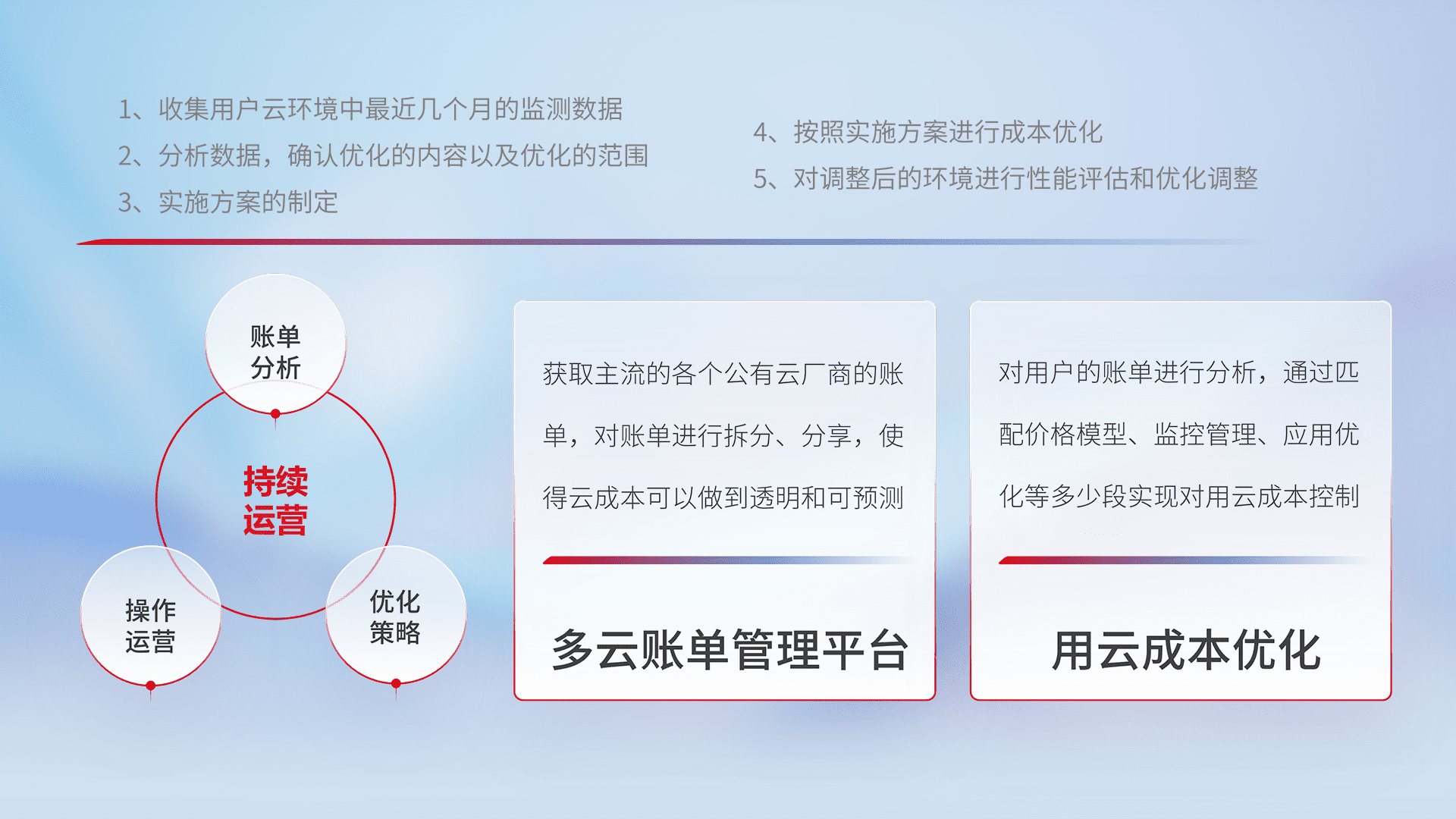 通过多云纳管,,,,以统一的资源数据模型把客户的云资源进行抽象和封装,,进而实现对多云资源的统一操作,,,保障云资源管理的可靠性、、、、稳定性与可用性。。量身定制化运维内容,,配置、、、开发运维、、、、补丁管理、、、、备份、、、监控、、、、认证和访问管理、、、审计和日常巡检等,,,保障在用云过程中的可靠度,,稳定度以及高可用率。。